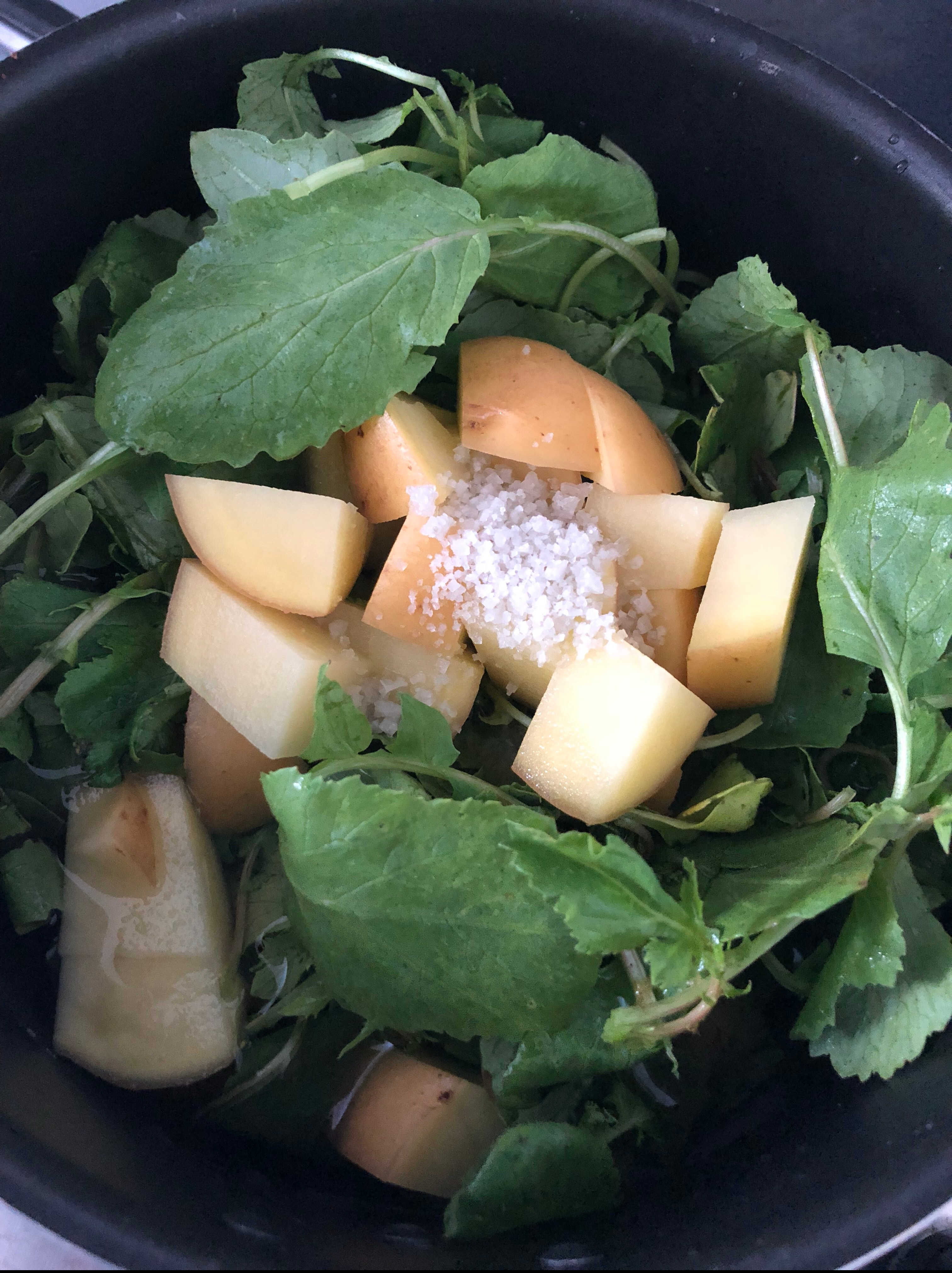 Fanes de radis, cubes de pomme de terre, sel de Guérande