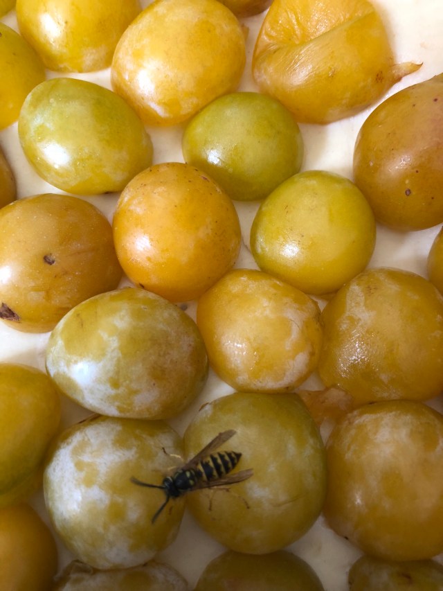 Sans parler je lui ai dit : il y a de la place pour deux, je t’embêterai pas, fais-en autant, je te prie. Pas folle, la guêpe m’a fichu la paix pendant que je disposais les demi-mirabelles en cercles concentriques.