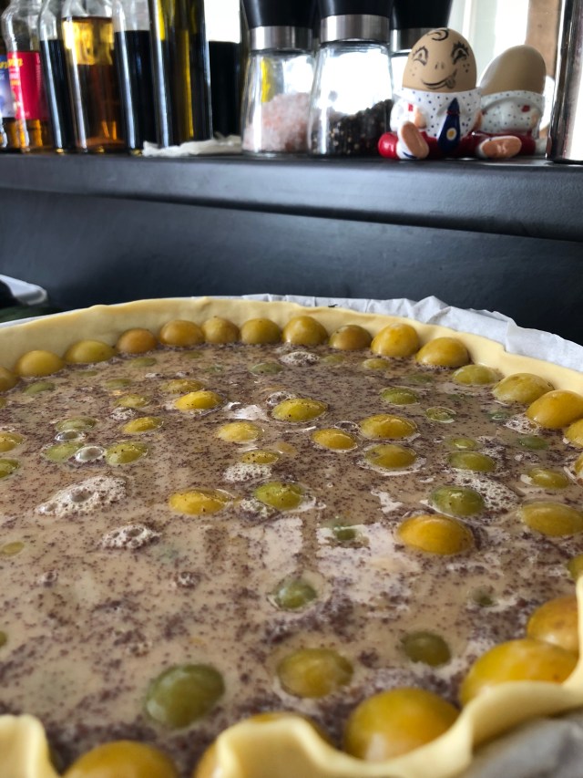 J’en ai foncé un moule en acier, sourcils même pas froncés. Puis, une à une, les prunes j’ai dénoyautées pour les répartir sur la pâte que j’avais préalablement un peu partout des coups de dents d’une fourchette piquetée.