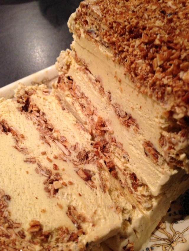 — Mettez ensuite 1/4 des amandes caramélisées au fond du moule puis une couche de glace à la vanille d’environ 2cm d’épaisseur puis 1/4 des amandes, puis glace, etc. et finissez par la dernière couche d’amandes.