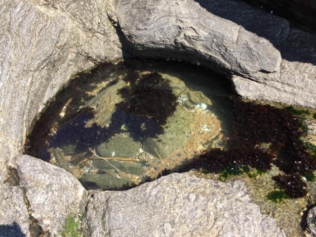 Non. C’est tout simplement, sur la plage, le creux d’un rocher – oh, pas plus grand que la main – qui a retenu un peu d’eau de la marée retirée, du sable et puis des algues…