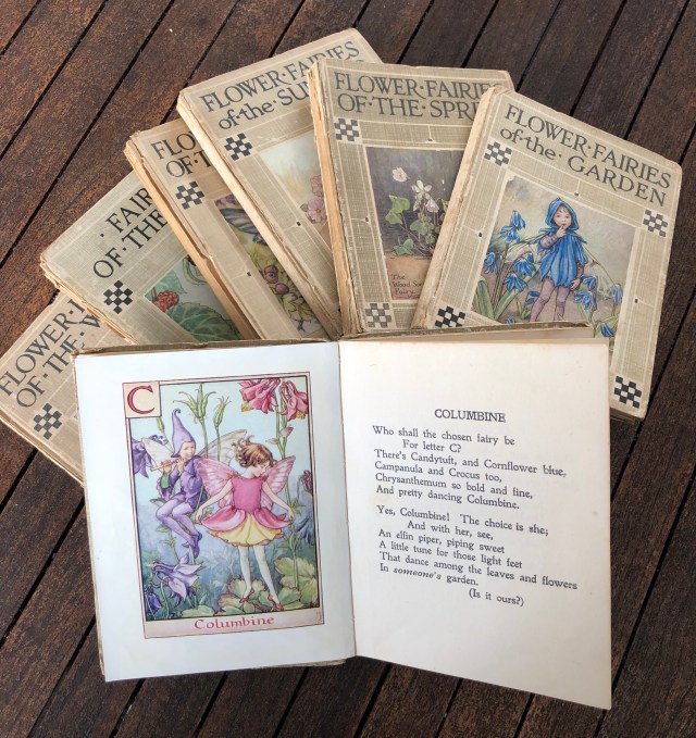 Les petits livrets des Flower Fairies de Cicely Mary Barker ont enchanté ma tendre enfance. Maman les avait rapportés d’un voyage qu’adolescente elle avait effectué à Londres. Sur la première page figure sa signature appliquée, avec son nom de jeune fille.