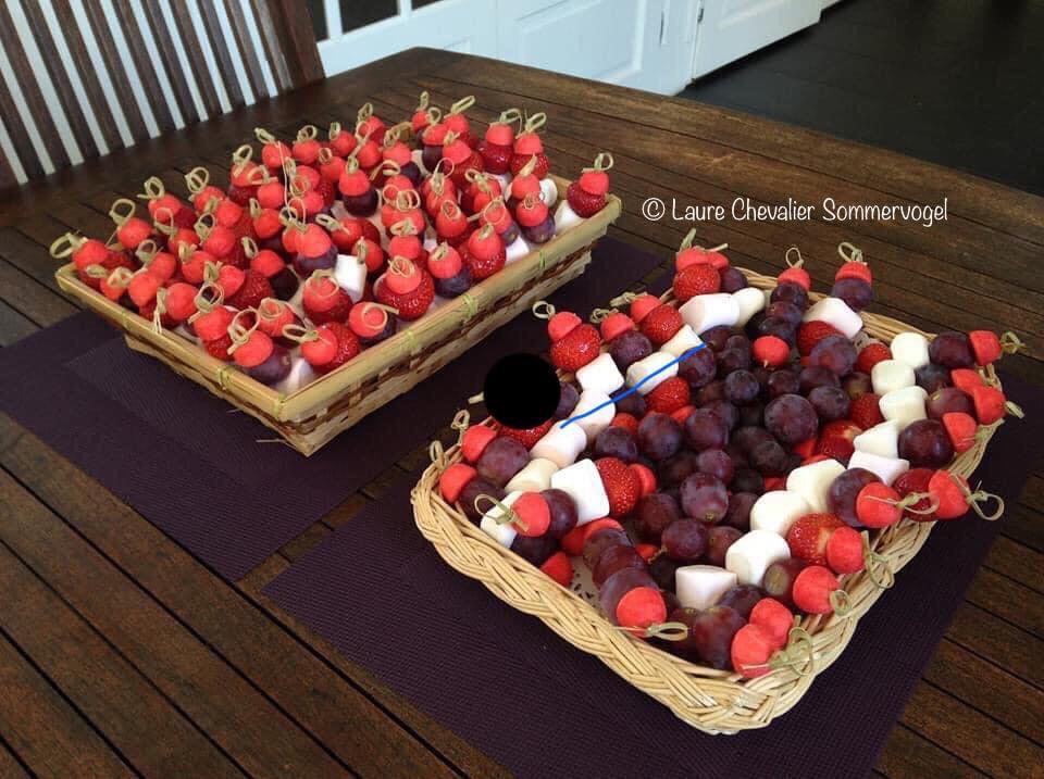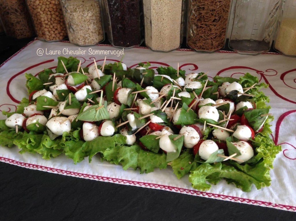 Brochettes de tomates cerises et mozzarella délicatement enrobées d’une feuille de basilic, sel et poivre et piment d’Espelette.