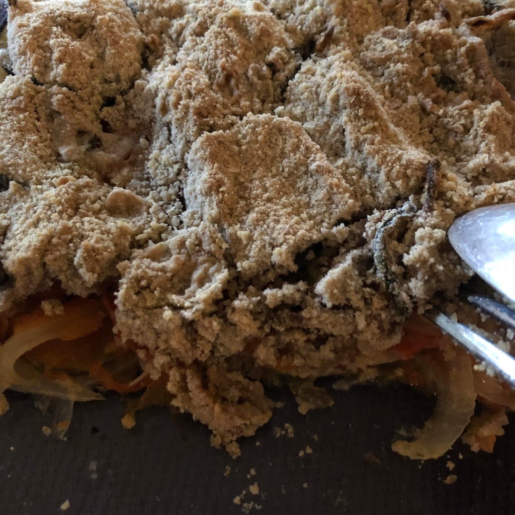 Avec de la farine de sarrasin. Ça change de goût par rapport à un crumble classique et ça fait un dîner léger ou un accompagnement original.