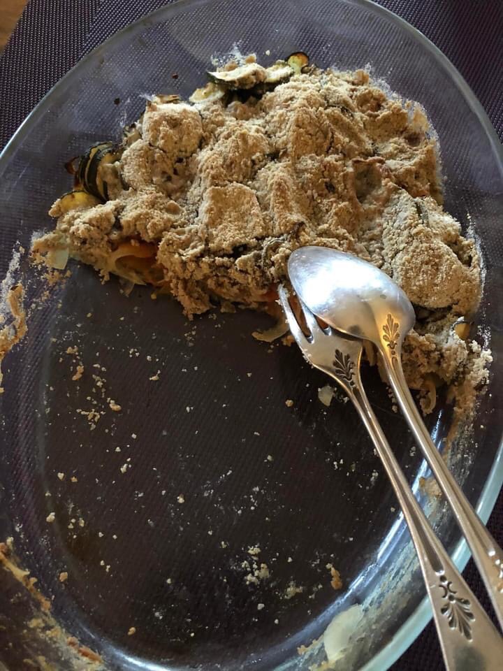 Répartissez la pâte de crumble sur le dessus et faites cuire pendant encore une vingtaine de minutes à four 180°.