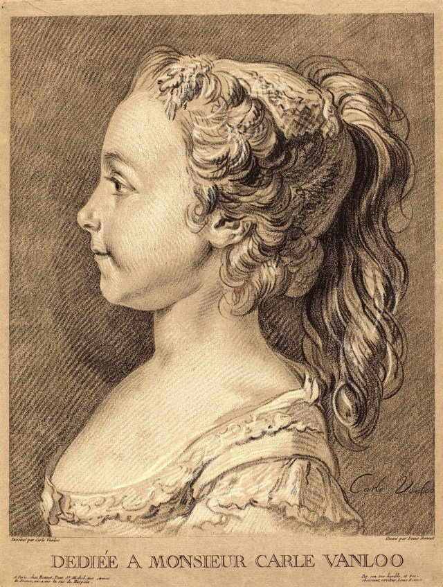 Illustration retrouvée sur le net : Louis-Marin Bonnet (France, 1736 – 1793), élève du peintre Carle Vanloo, (France, 1705 – 1765) – Marie-Rosalie Vanloo c. 1784 – Gravure « manière de craie » imprimée à l’encre noire et blanche sur papier gris-brun, 40 × 30.2 cm