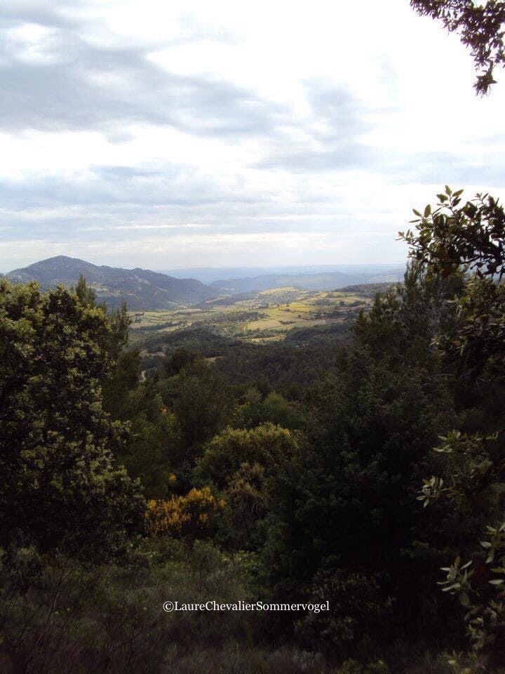 Nous passions par de petits sentiers à la végétation touffue, étroits et escarpés. La vue était à couper le souffle : le regard portait loin, par chaque trouée dans les branchages, sur la vaste plaine qui s’étendait sous nos yeux. Et moi je m’exclamais, je m’enchantais, je m’émerveillais, tout en faisant bien attention à l’endroit où je posais les pieds sur le sol caillouteux et inégal.