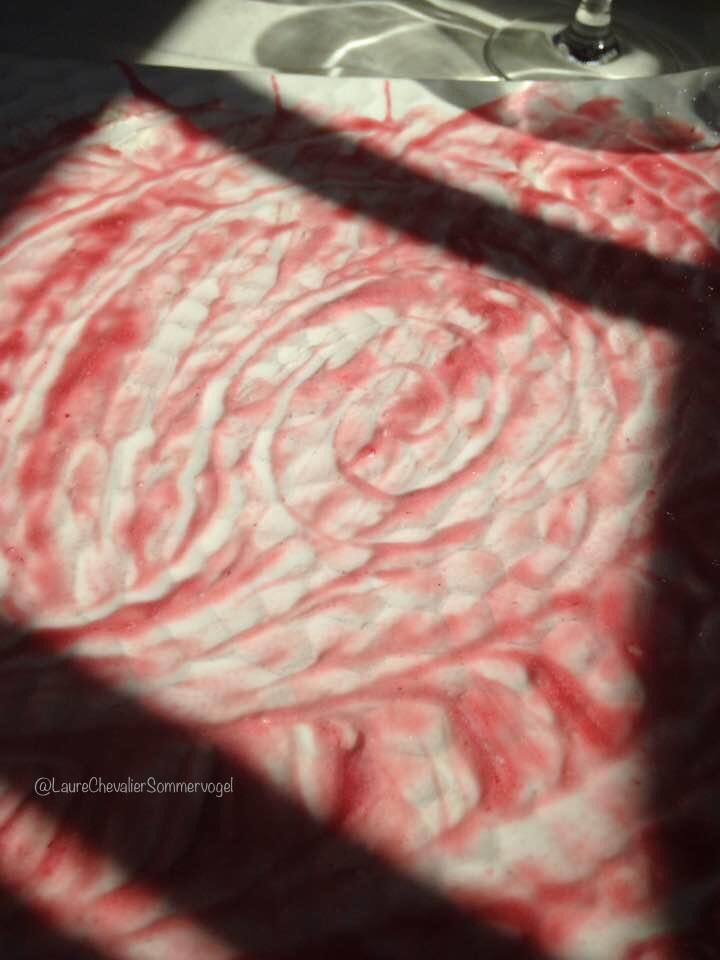 Déjeuner au restaurant, il y a quelques années. D’un reste de coulis de framboises sur bavarois glacé maculant mon assiette j’avais, de la pointe de ma fourchette à gâteau, consciencieusement réalisé ce joli dessin. Oui, je le trouvai très joli. Plus joli du moins qu’une assiette salie. Et puis cela avait occupé, un peu, mes pensées. Un moment.