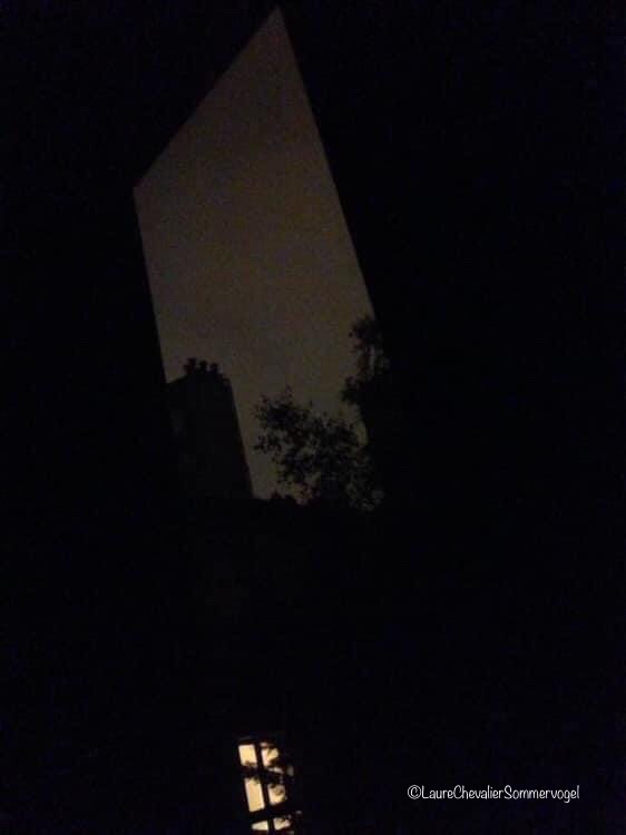 La photo – je sais bien qu’elle est sombre, c’est une photo prise de nuit, comme un œil au-delà des fioritures focuse et focalise son attention sans visuelles vocalises – la photo reproduit à l’identique-tac-toc la vue que j’avais depuis la fenêtre de la chambre où je dormais ensuite.