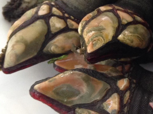 La partie du bout, belle comme de l’émail cloisonné, ressemble à une sorte de bijou un peu spécial. C’est bizarrement fendu et, hum, aussi curieuse puis-je être, je me demande si j’ai véritablement envie de voir ce qui se trouve à l’intérieur.