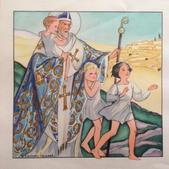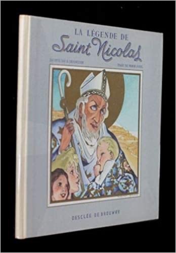 Il existe de nombreuses images représentant l’histoire de saint Nicolas. J’ai choisi celle-ci parce que je la connais bien. Elle provient d’un livre paru en 1951 aux éditions Desclée de Brouwer, illustrations couleur de Manon Iessel, texte de G. Crouzevier. Il se trouvait chez mes grands-parents.